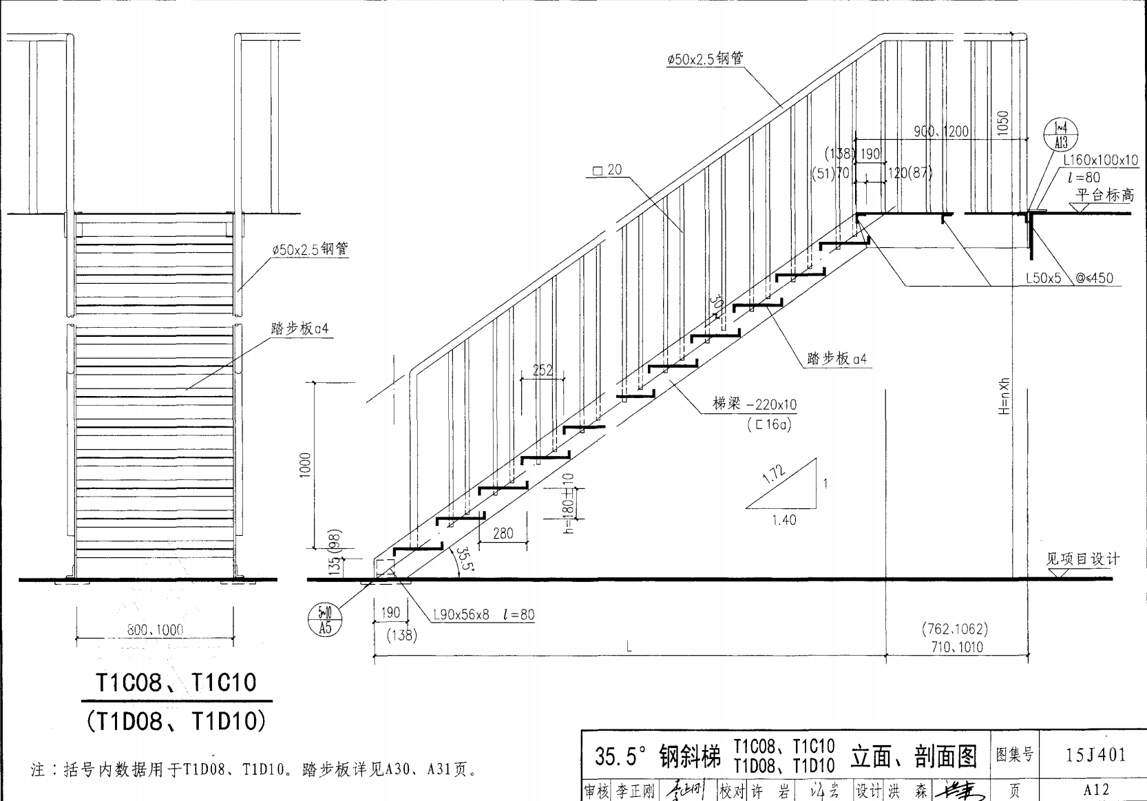 | 鋼斜梯D | 35.5°(1:1.4) | T1D08 | 800 | 〔16a | 3.30 | a~c |