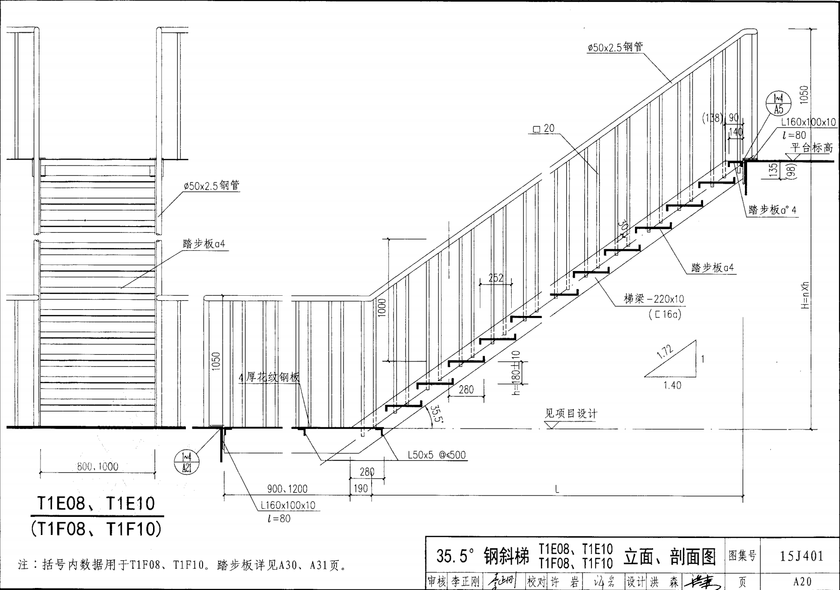 | 鋼斜梯A | 35.5°(1:1.4) | T1A08 | 800 | -200X10 | 3.60 | a~c |