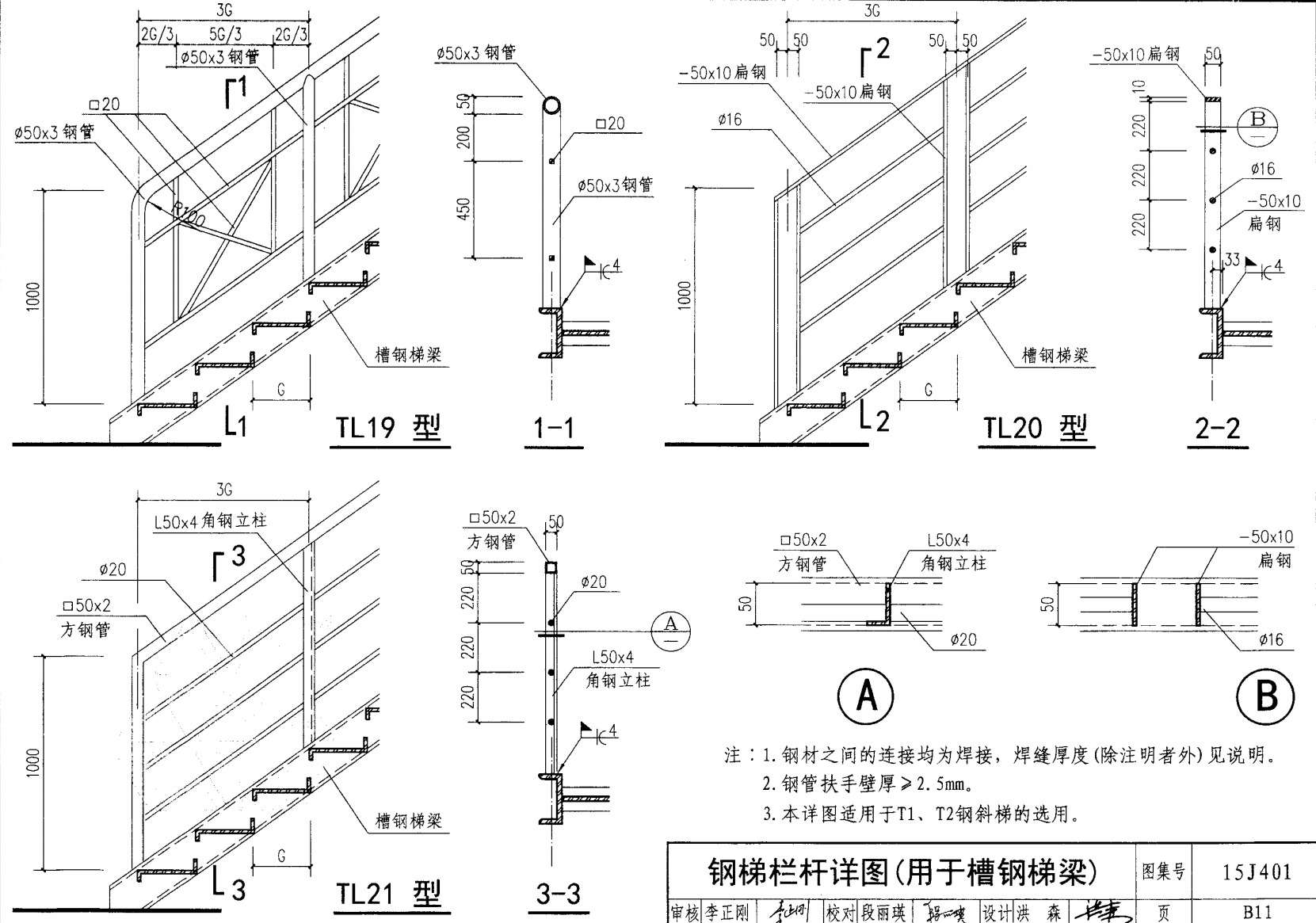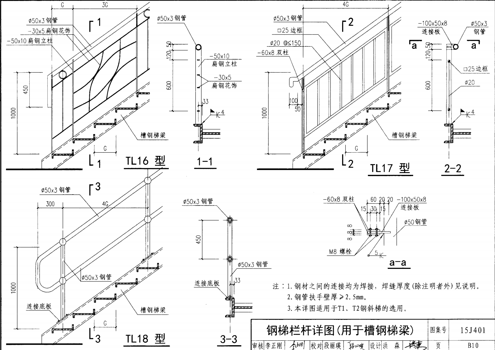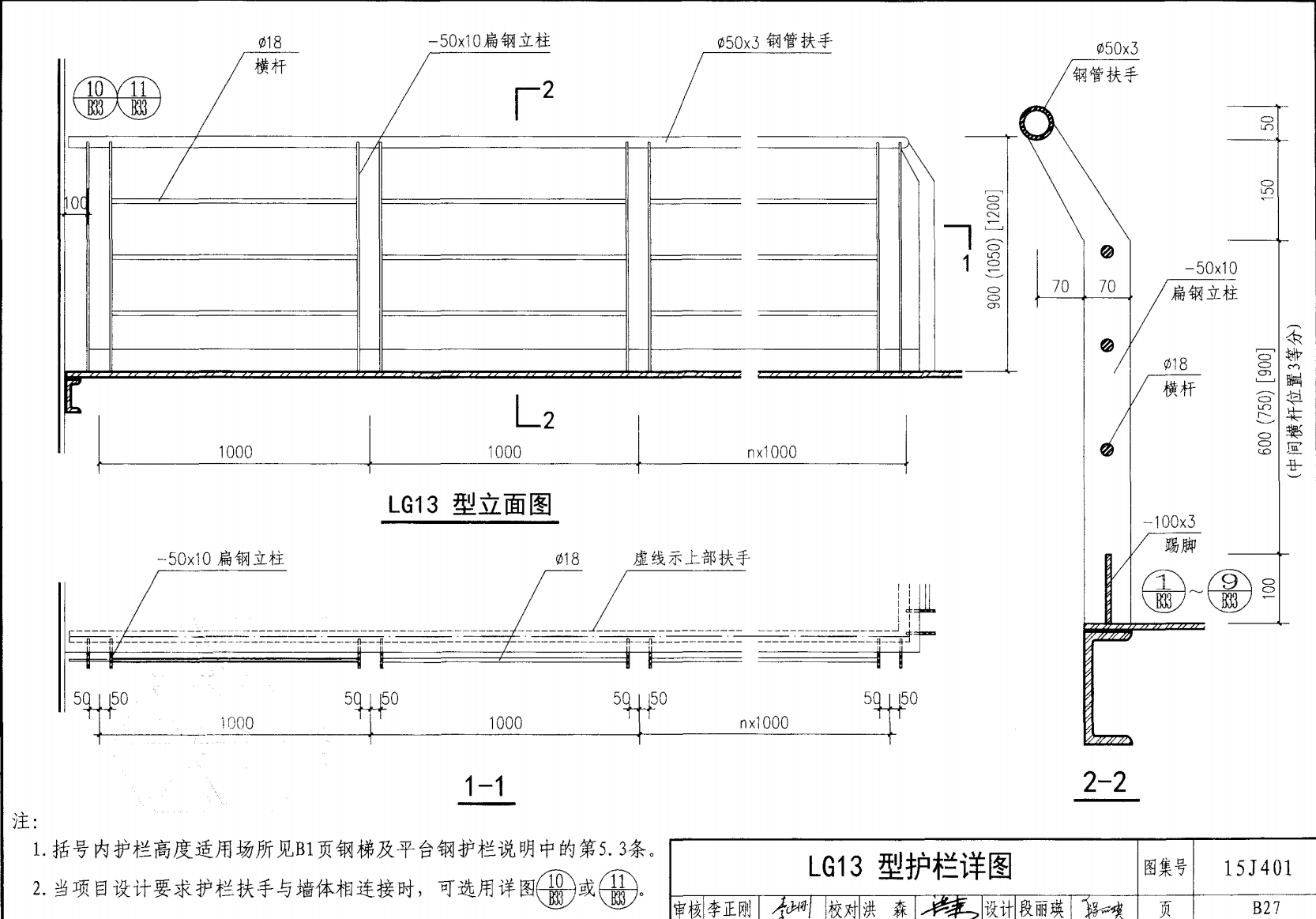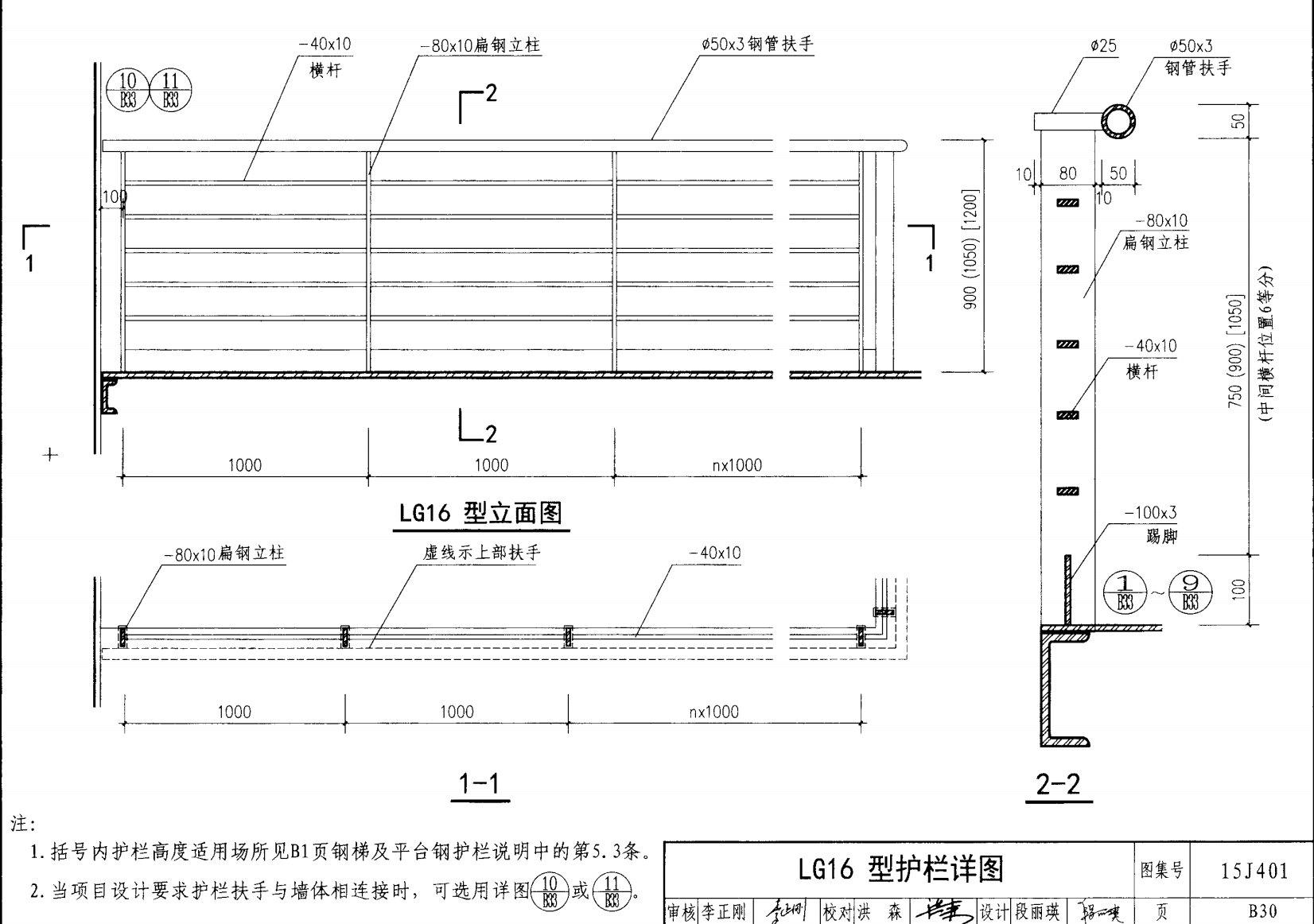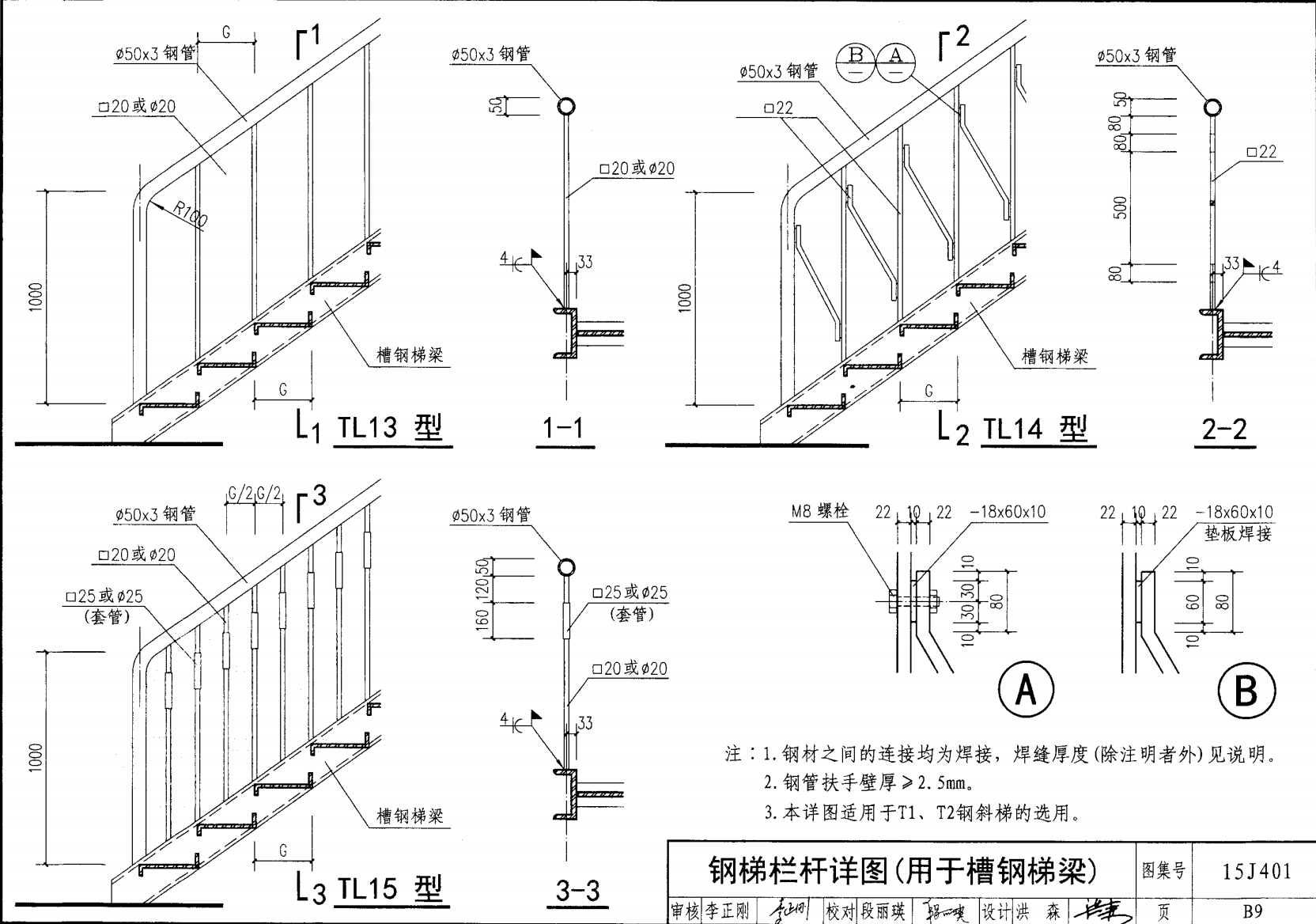 欄桿采用鋼材力學性能不低于 格證的鋼材Q235-B ,并具有碳含量合 所有欄桿均可用不銹鋼制作 欄桿的焊接要求應符合《鋼結構工程施工質量驗收規(guī)范》 GB50205-2001 證結構設計強度的規(guī)定。當焊接不便時可用螺栓連接,但應保 鋼質欄桿的涂裝要求可以熱鍍鋅和噴漆,噴塑 施工中如果用其他型鋼取代圖集中的立柱或減少立柱截 面尺寸,都應按荷載規(guī)范認真核算,以確保安全