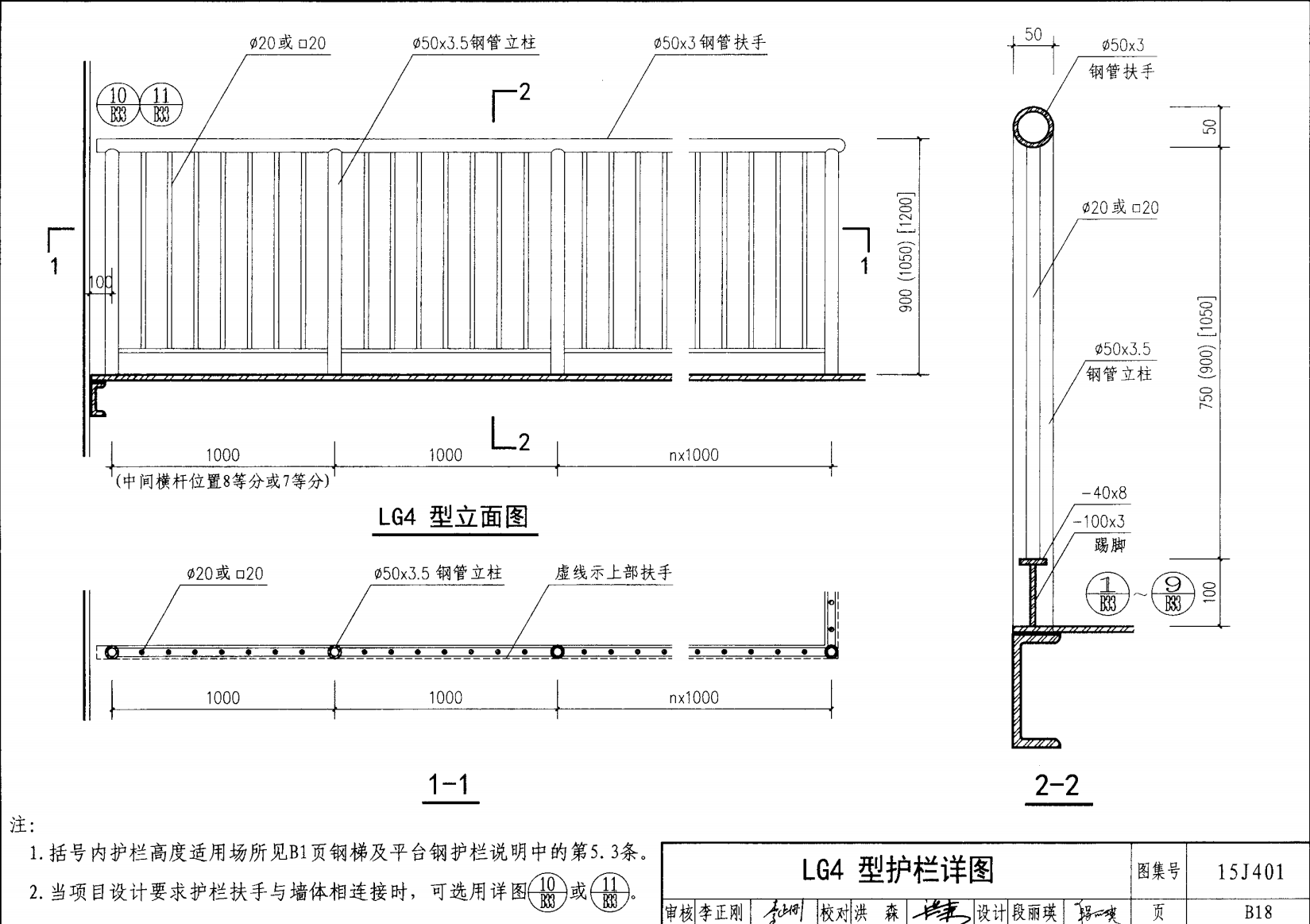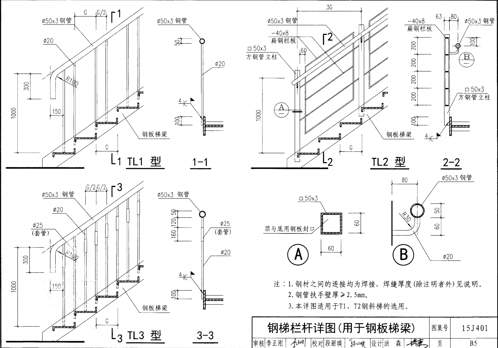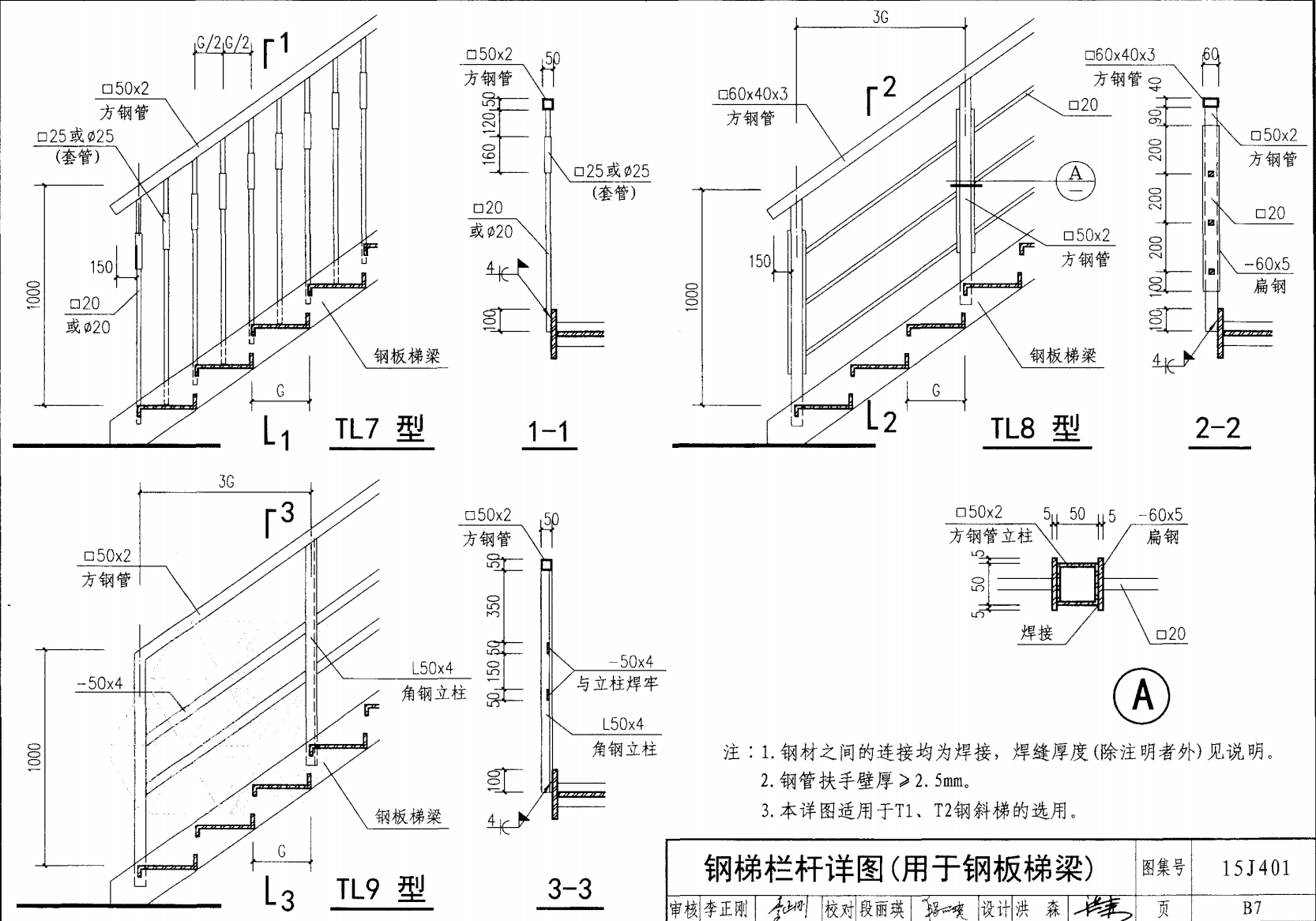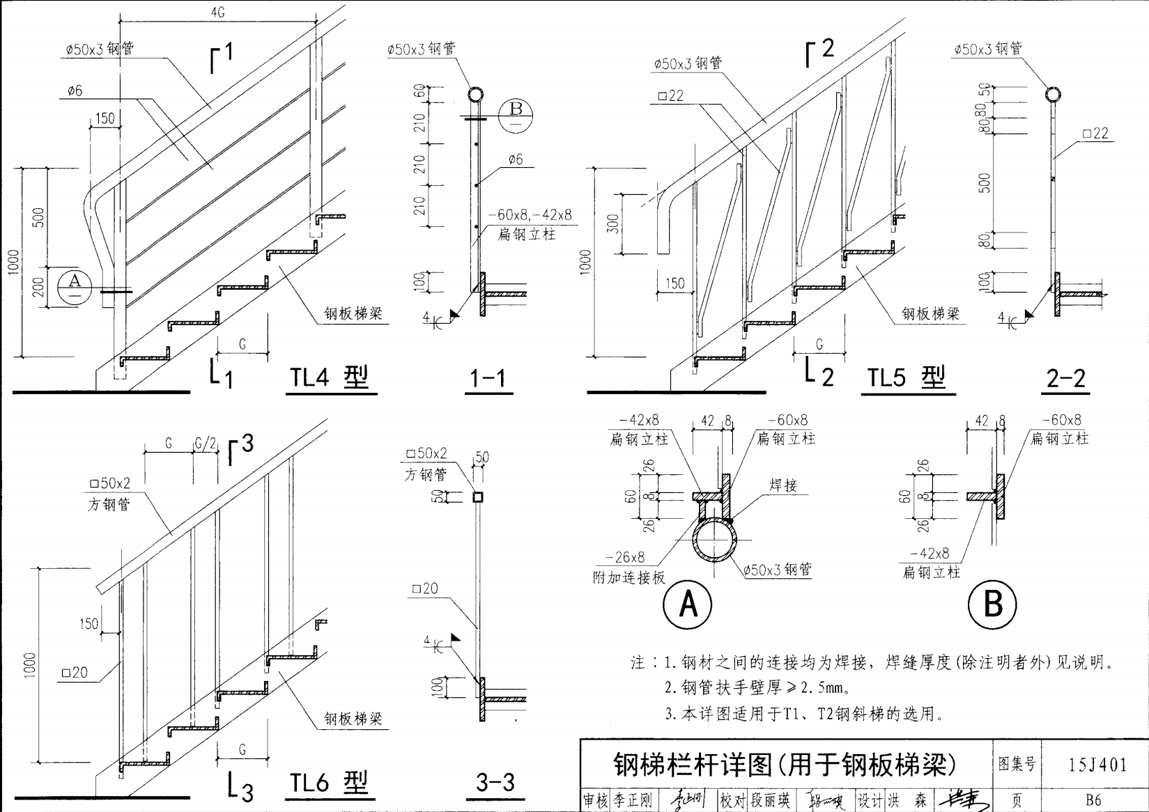 欄桿采用鋼材力學性能不低于 格證的鋼材Q235-B ,并具有碳含量合 所有欄桿均可用不銹鋼制作 欄桿的焊接要求應符合《鋼結構工程施工質量驗收規(guī)范》 GB50205-2001 證結構設計強度的規(guī)定。當焊接不便時可用螺栓連接,但應保 鋼質欄桿的涂裝要求可以熱鍍鋅和噴漆,噴塑 施工中如果用其他型鋼取代圖集中的立柱或減少立柱截 面尺寸,都應按荷載規(guī)范認真核算,以確保安全