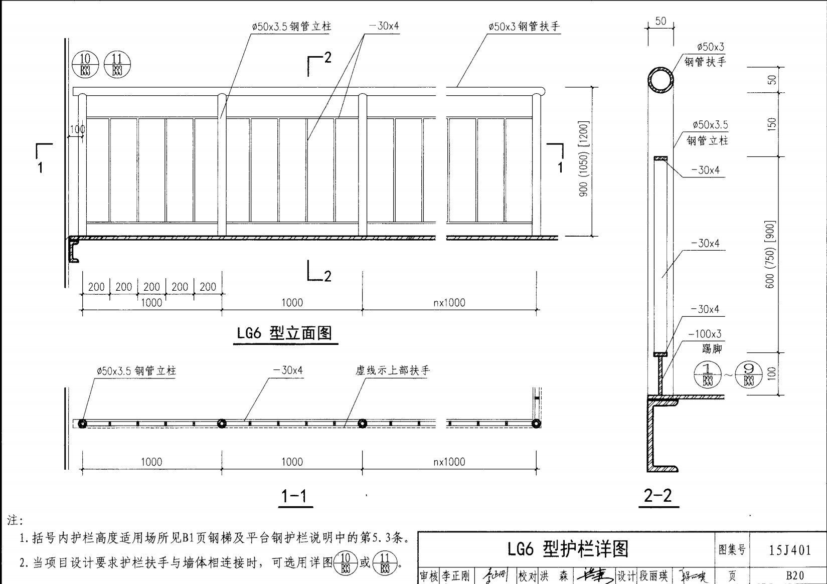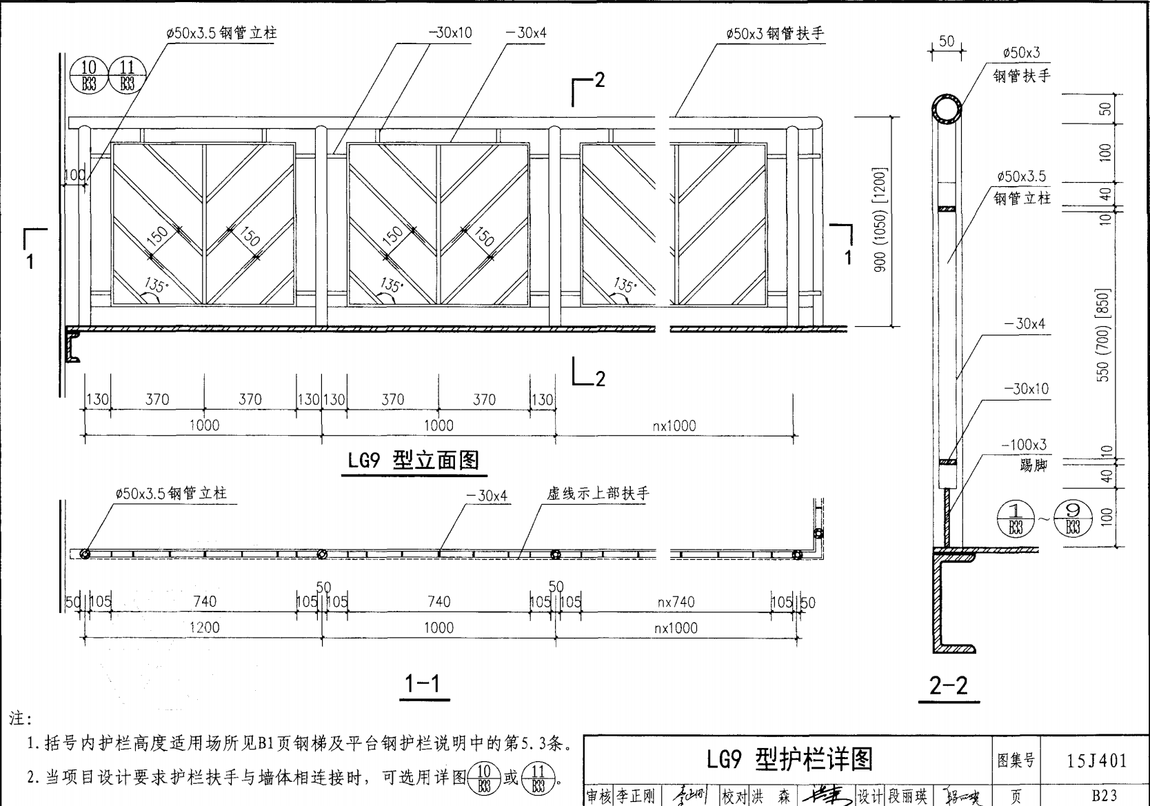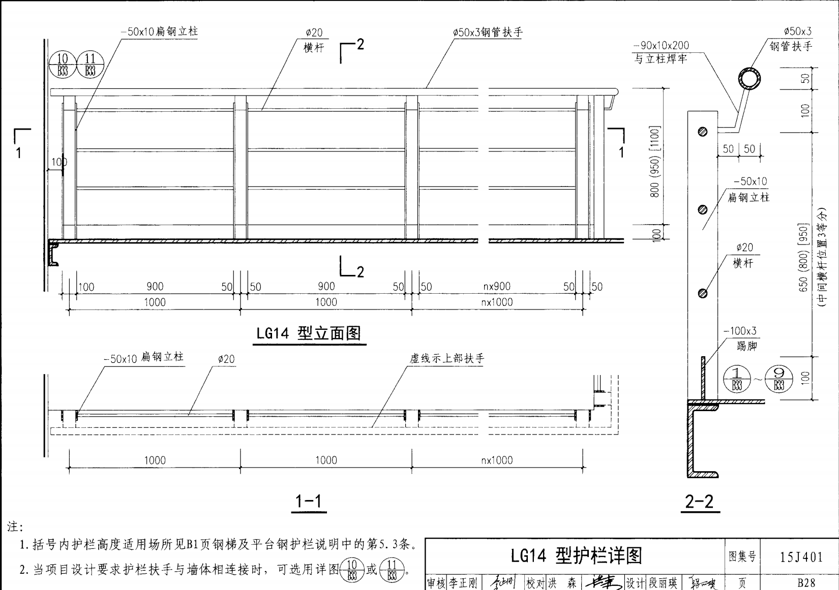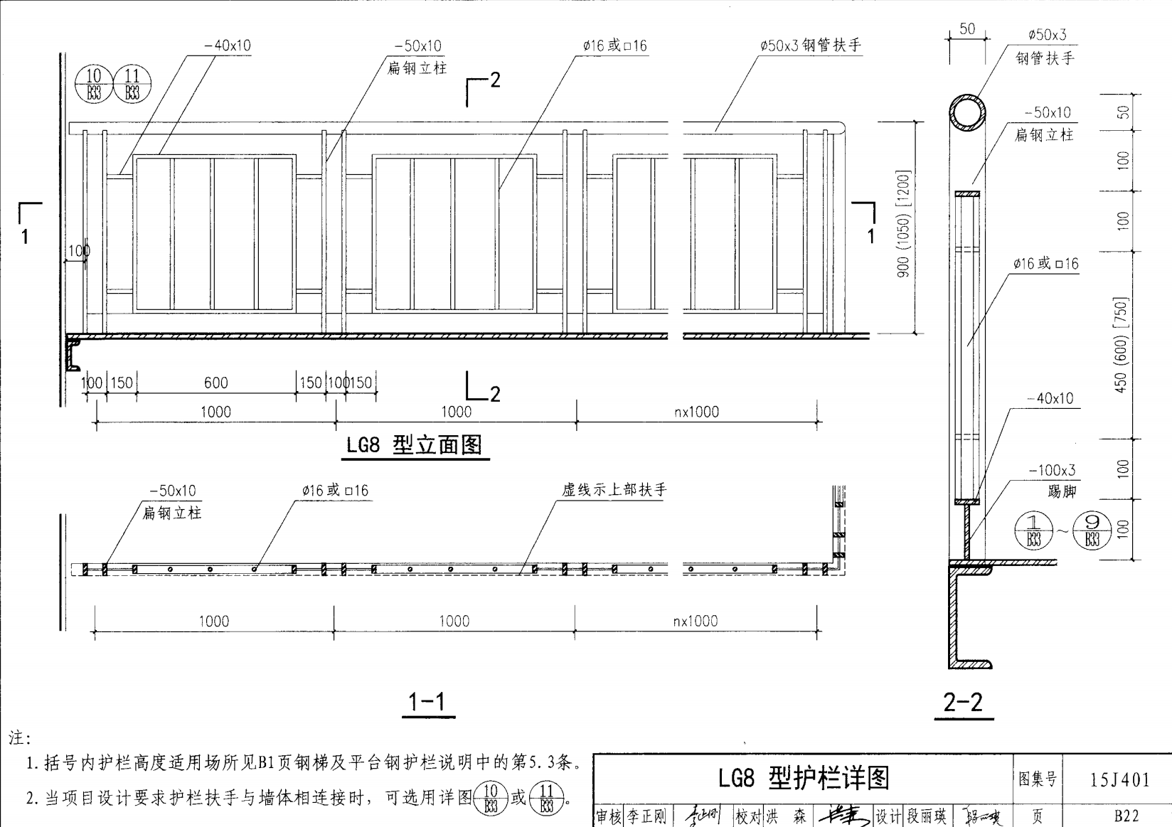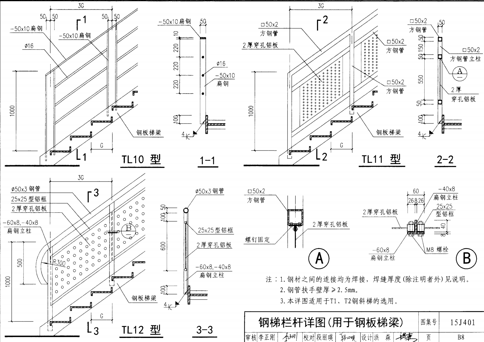 欄桿采用鋼材力學性能不低于 格證的鋼材Q235-B ,并具有碳含量合 所有欄桿均可用不銹鋼制作 欄桿的焊接要求應符合《鋼結構工程施工質量驗收規(guī)范》 GB50205-2001 證結構設計強度的規(guī)定。當焊接不便時可用螺栓連接,但應保 鋼質欄桿的涂裝要求可以熱鍍鋅和噴漆,噴塑 施工中如果用其他型鋼取代圖集中的立柱或減少立柱截 面尺寸,都應按荷載規(guī)范認真核算,以確保安全