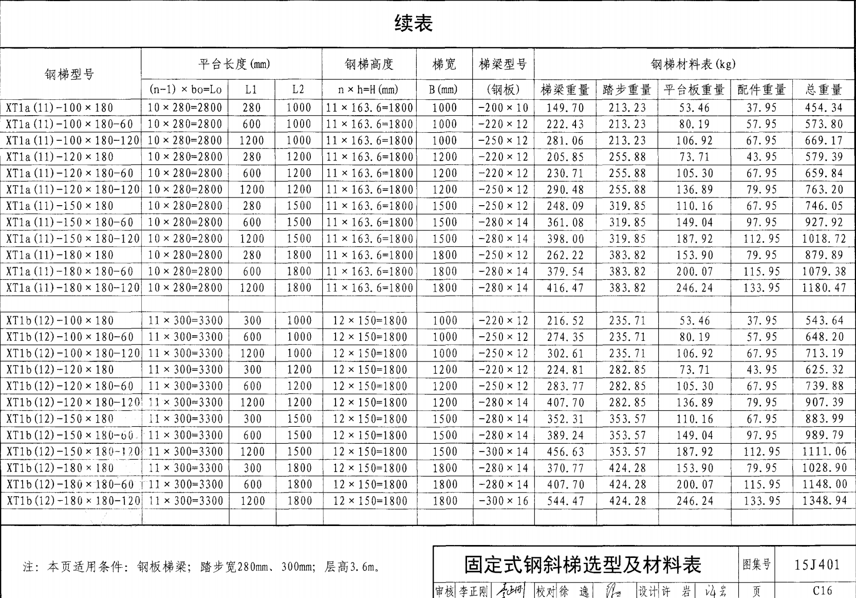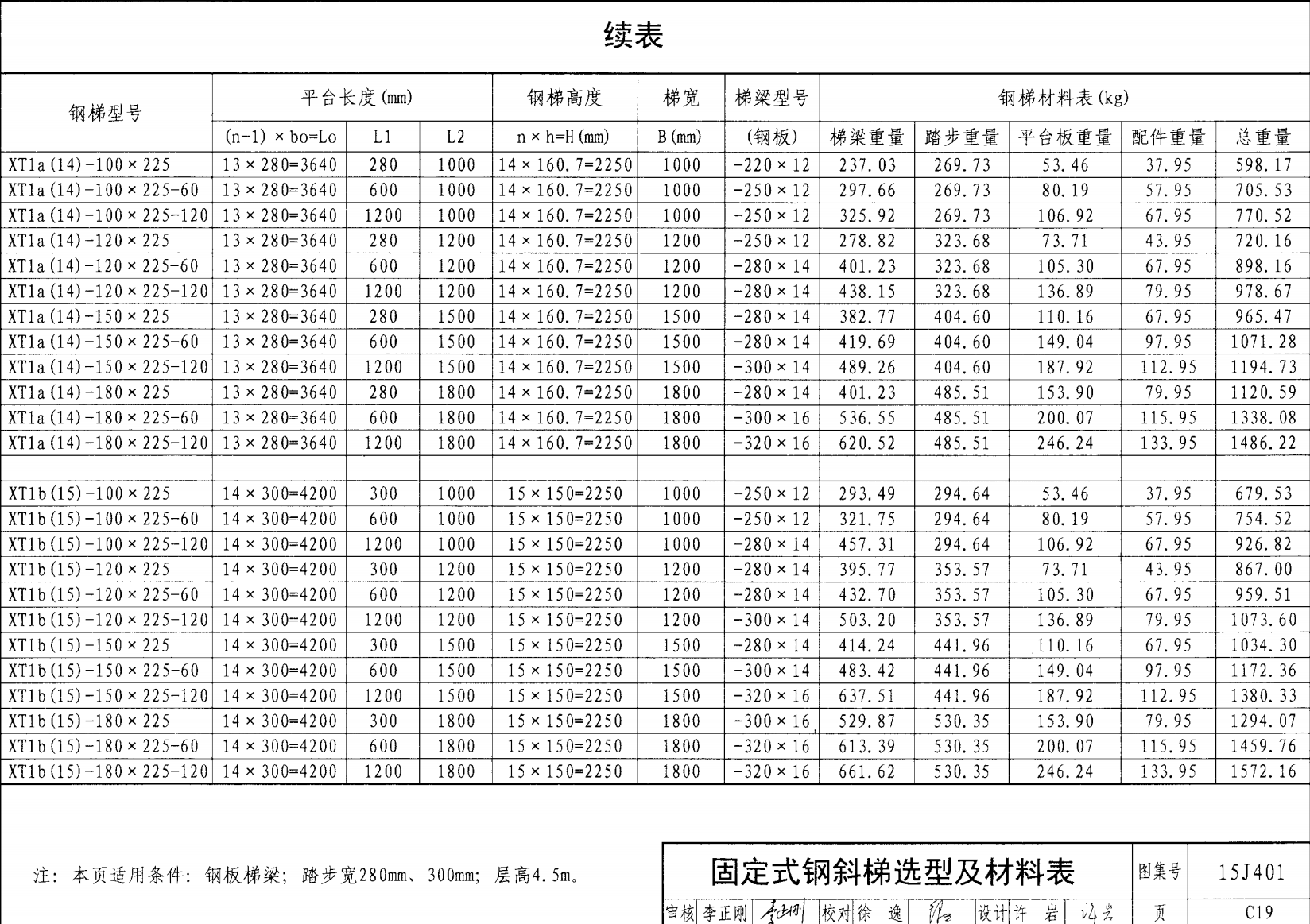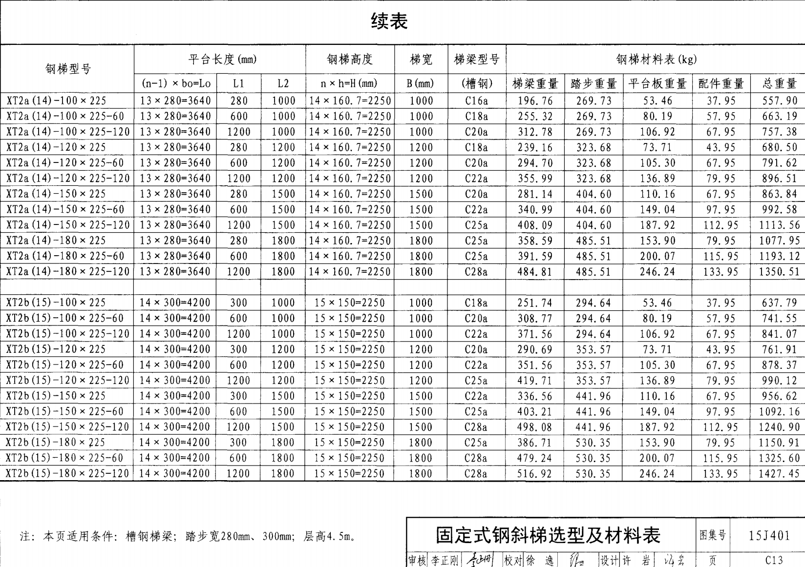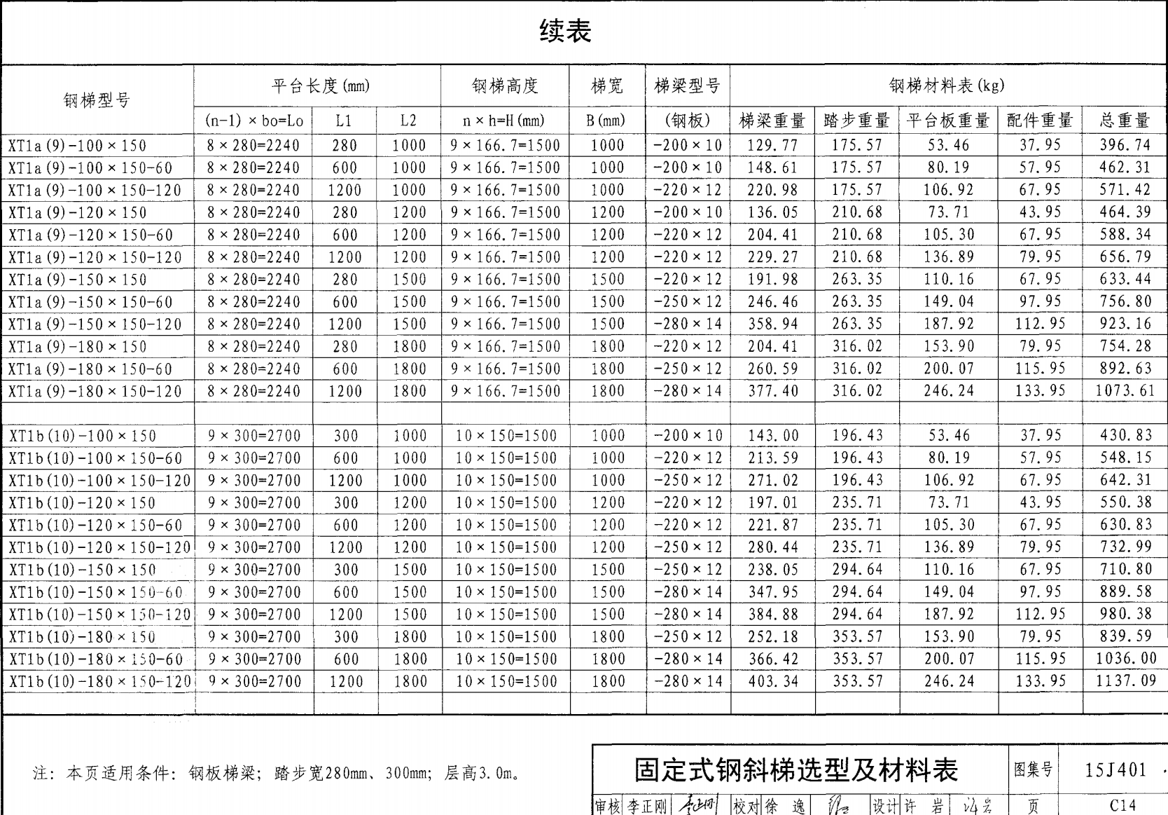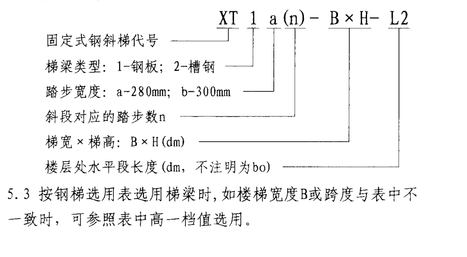 • 按鋼梯選用表選用梯梁時,如樓梯寬度 或跨度與表中不一致時,可參照表中高一檔值選用