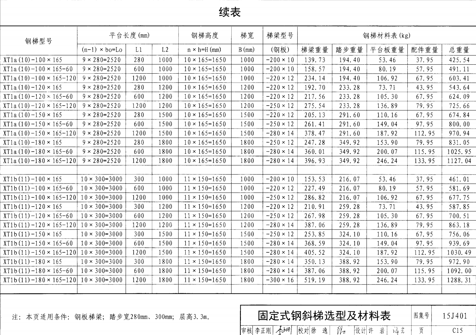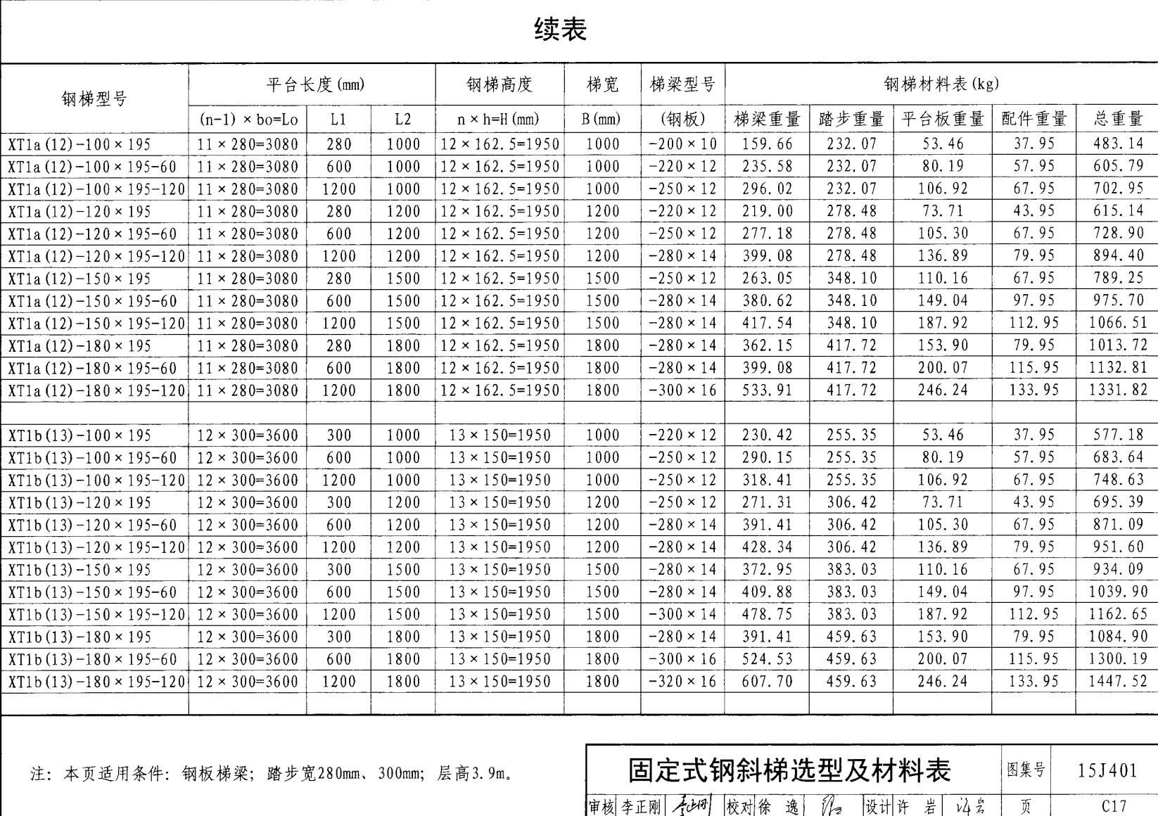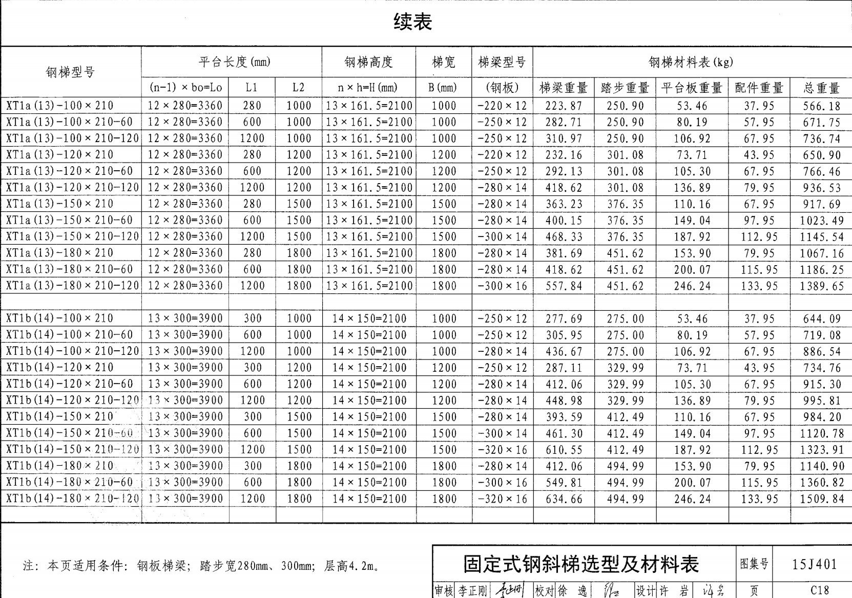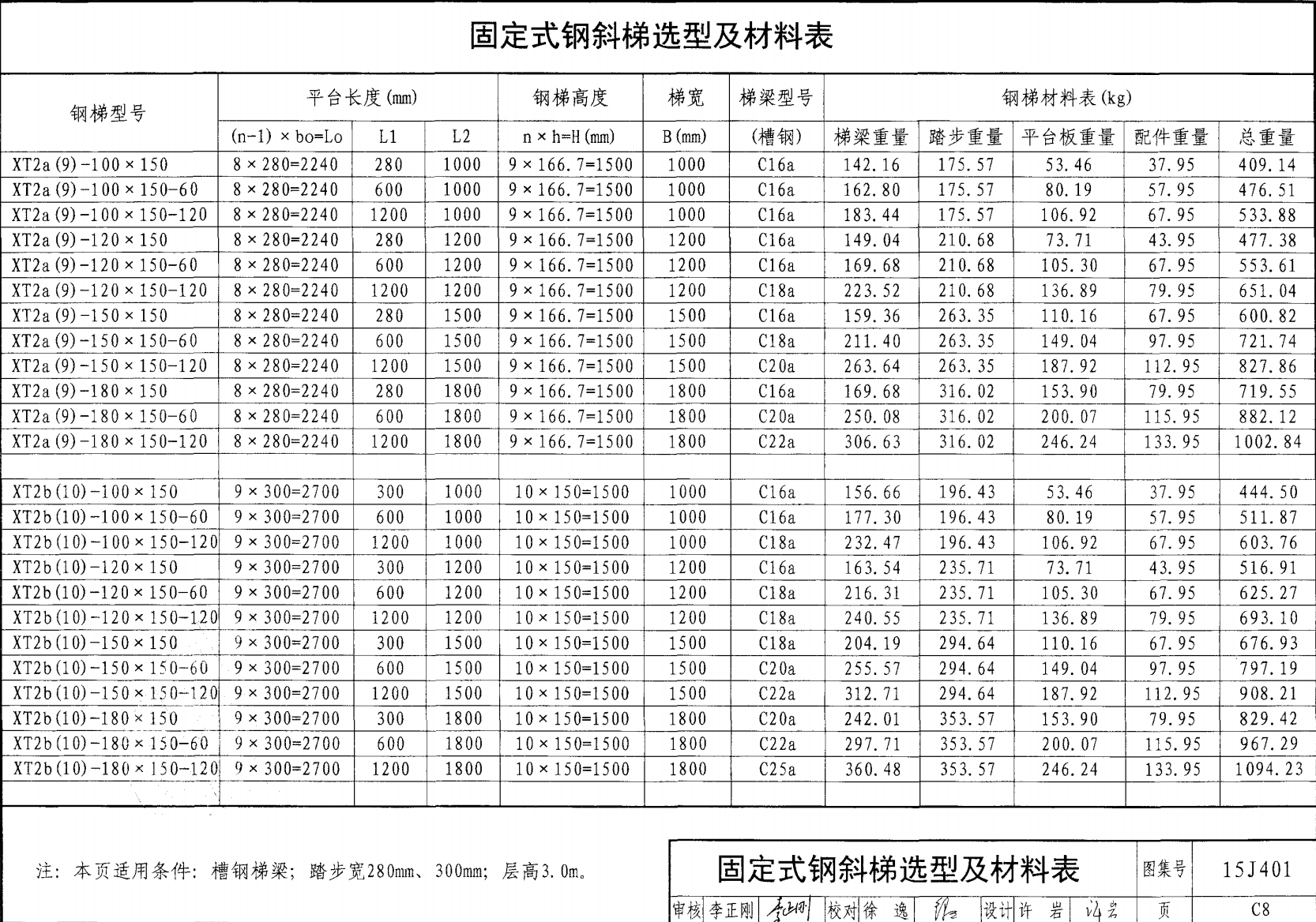 • 按鋼梯選用表選用梯梁時,如樓梯寬度 或跨度與表中不一致時,可參照表中高一檔值選用